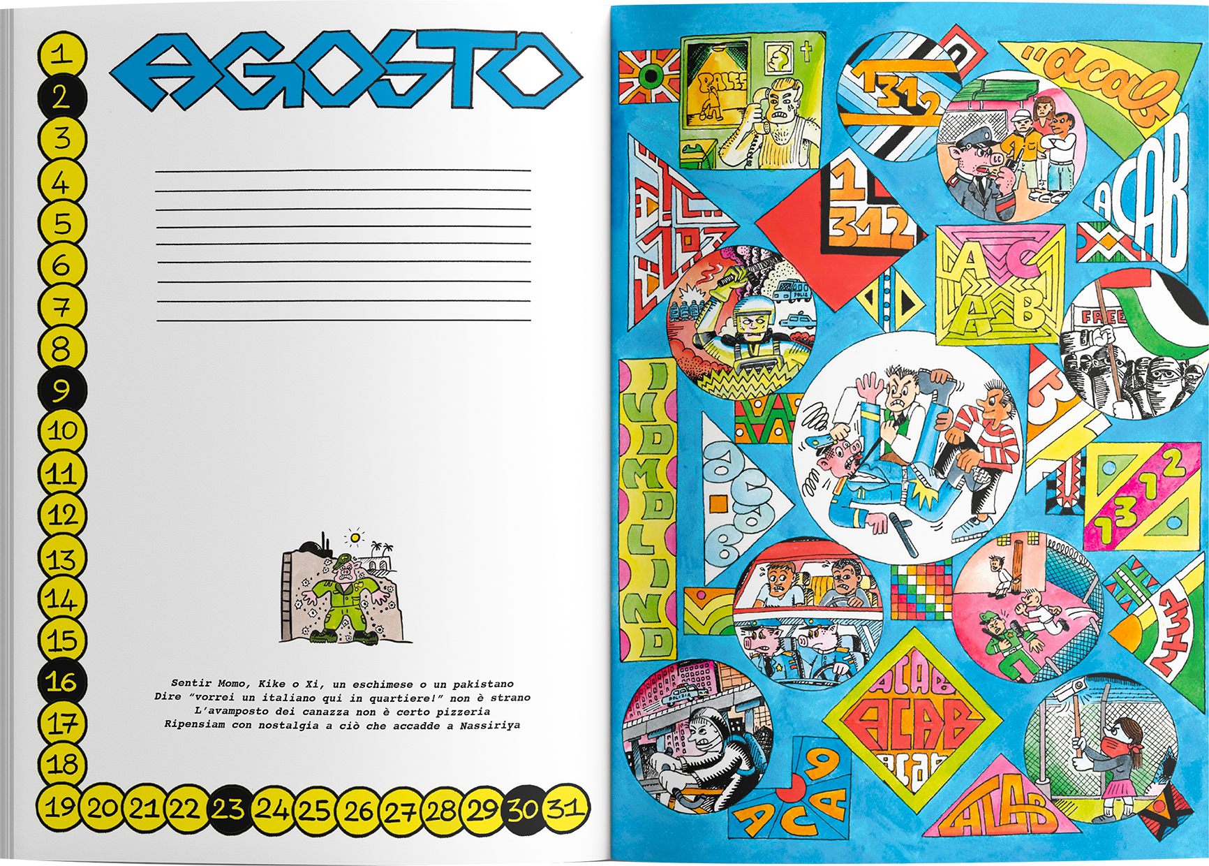 Frankenstein Magazine e Ivo Molino tornano a collaborare con una parodia del classico calendario dei carabinieri in chiave satirica e antiautoritaria.